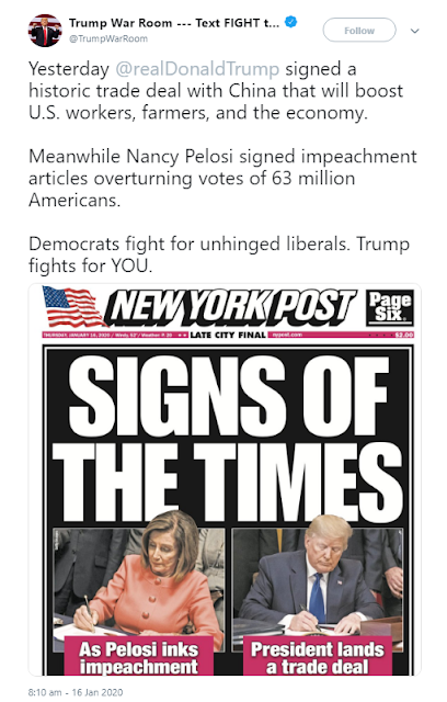 The USMCA was approved by the Senate today (approved by the House on December 19, 2019) and the China Phase I deal was signed by the President and China yesterday. Both of these deals were made this week while Democrat House Speaker Nancy Pelosi's impeachment team delivered their Two Articles of Impeachment to the Senate for their upcoming trial of President Trump, which will begin next Tuesday.