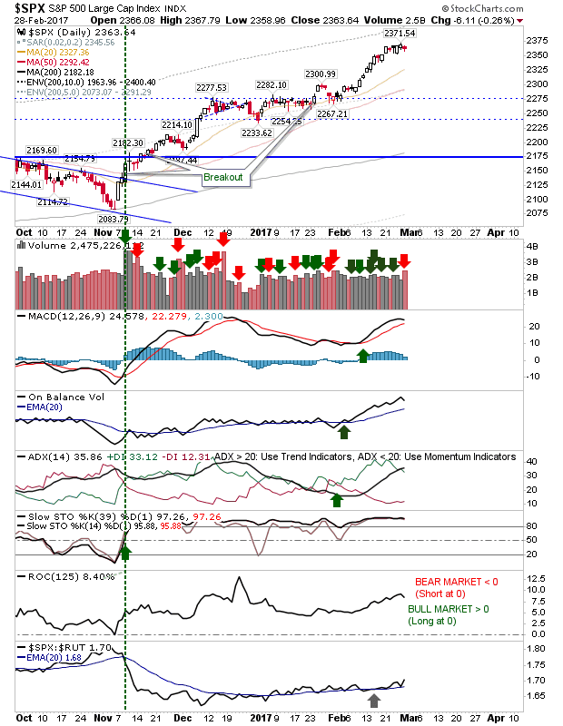 After successfully defending former resistance turned breakout support, the Russell 2000 experienced a relatively heavy reversal. It hasn't yet given up breakout support, but the index now finds itself back at the 20-day MA. It did so with a 'sell' trigger in the MACD and another relative loss in performance against the Nasdaq.