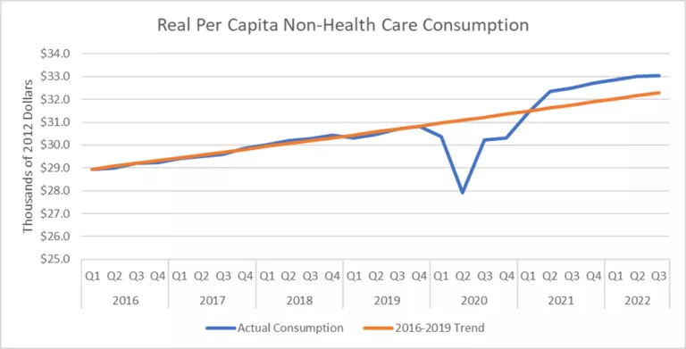 As can be seen, non-healthcare consumption, after falling during the worst period of the pandemic, jumped up in 2021, putting it well above its pre-pandemic trend. In the third quarter of this year, real per capita non-healthcare consumption was 2.3 percent above its pre-pandemic trend. That doesn’t look like a story of hardship.