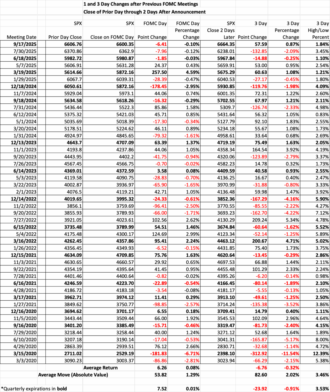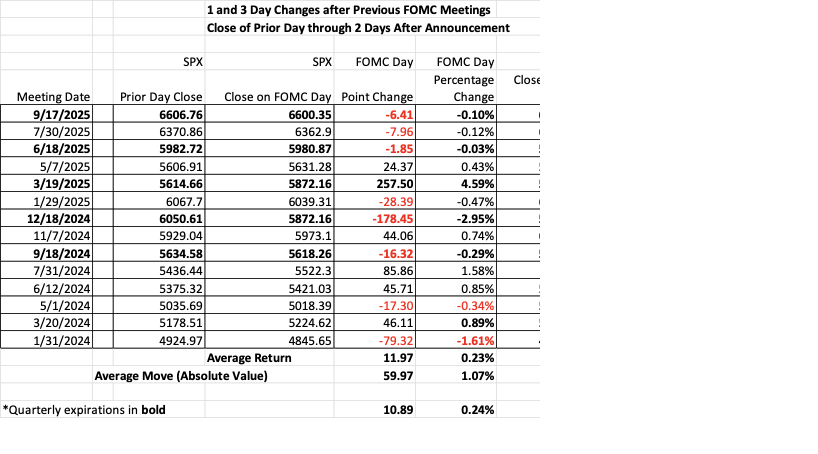 We can see from the values in the top right corners of the charts that the implied daily volatilities for both SPX expiries remain just below 1%.Looking at the history of SPX moves after FOMC meetings, we see that those assumptions could be considered quite high by recent standards, but relatively low when we look at longer post-FOMC histories.The tables below show the 1- and 3-day moves in SPX after FOMC meetings in point and percentage terms – including absolute values.The larger table is the total history since Covid; the smaller one is the history since the Fed ended its post-Covid hiking cycle. The past four one-day moves have been quite modest, implying that the ~1% volatility expectations are more than generous; yet if we look at longer-term averages, they seem rather low. Considering the other exogenous factors, I’d take the over.