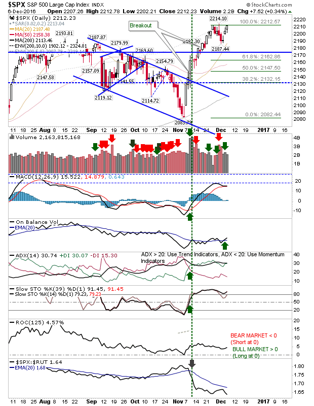 Other indices gained, but none are as overvalued as the Russell 2000. The S&P is close to breaking to new highs.