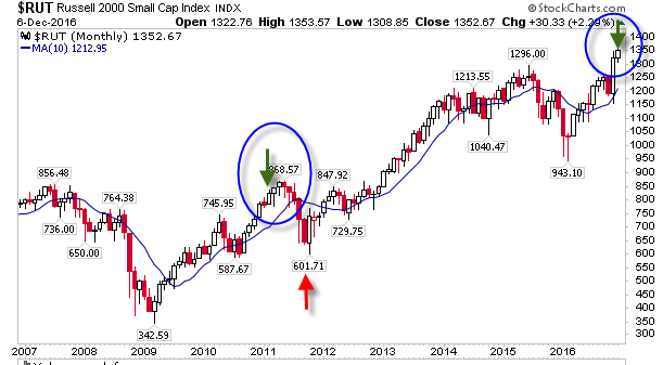 The Russell 2000 pushes again into the 10% zone of historic high prices (1,388 would be enough for the 5% zone last seen in February 2011). Back in 2011 the index rallied for another couple of months before it lost 30% from its high. The next few weeks would be a good opportunity to take some money off the table to use on the next swing low.