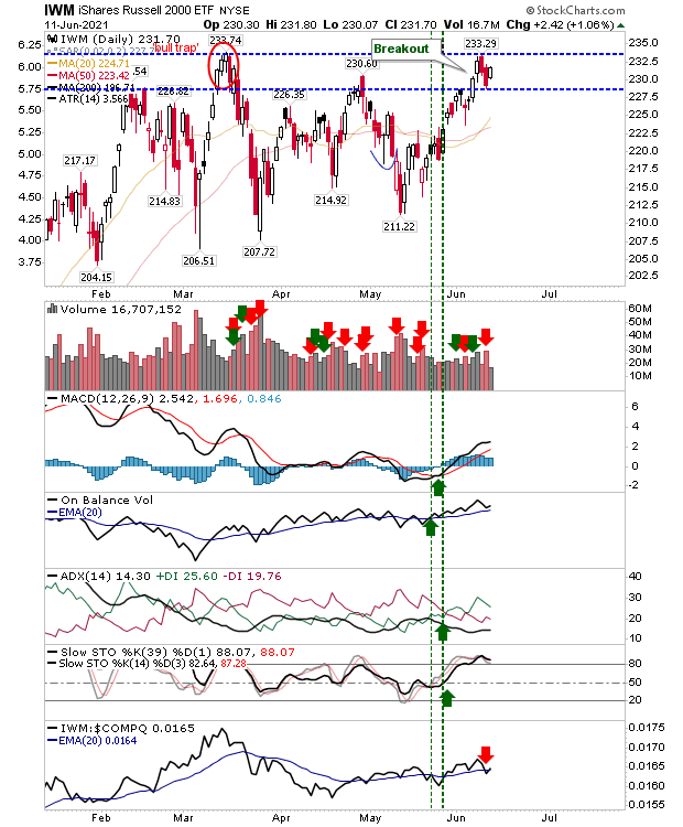The Russell 2000 has perhaps the best of Friday's action as it recovered some of Thursday's losses. It's nicely positioned to challenge $233.74 ($IWM) with the index ticking up relative to the Nasdaq.