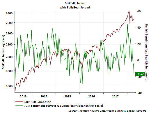 Additionally, bearish sentiment jumped 6.1 percentage points to 42.8% resulting in the bull/bear spread being reported at a negative 16.7 percentage points, the widest negative spread in more than a year.