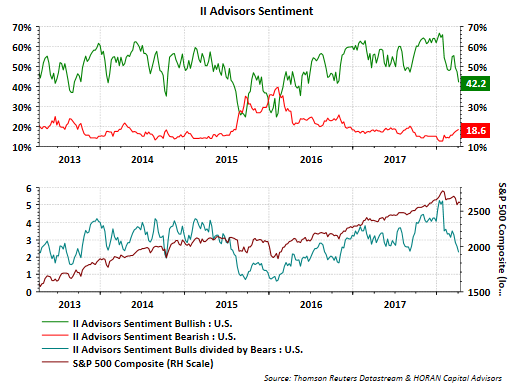 Aldo, newsletter writers are far less bullish with the bullish sentiment falling to 42.2% from nearly 70% at the beginning of this year. The Investor Intelligence Advisors' Sentiment bull/bear ratio has fallen to nearly 2:1 versus over 5:1 at the beginning of the year as well. The II Advisors' Sentiment Survey studies over a hundred independent market newsletters and assesses each author’s current stance on the market: bullish, bearish or correction.