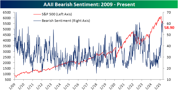 Of course, that is still a muted level of bullish sentiment. Meanwhile, the percentage of respondents reporting as bears is much more elevated than it was two months ago. Whereas the February 20 reading in bears was only 40.5%, today it is at 58.9% which was down versus 61.9% last week.