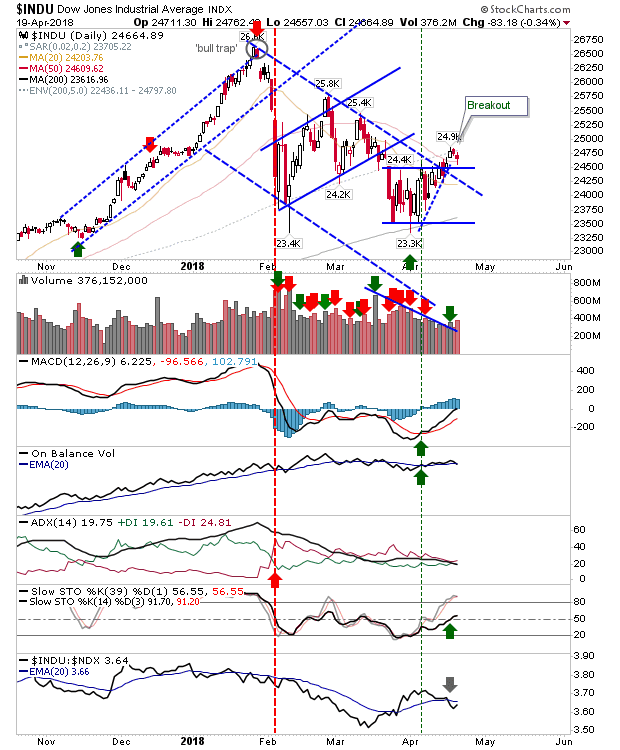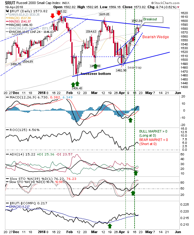 It's a similar play for the Russell 2000; a bearish evening star following a tag off symmetrical triangle resistance. Technicals are all still bullish although relative performance is weakening after managing a good recovery after weeks of under-performance. Aggressive shorts can play this but the S&P looks the better short play