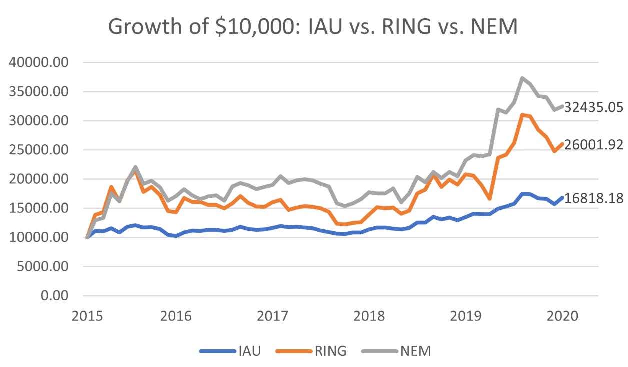 Let’s look at another alternative. The largest holding in RING, nearly 20%, is NEM, Newmont Corp. Indeed, from the time I started in the industry until the launch and subsequent acceptance of GLD and other ETPs to access gold bullion, NEM was the most frequent stock bought to access exposure to gold. During the same 5-year period NEM had a price appreciation of 25.3% accompanied by a 2.4% yield. As to tracking, the correlations between GLD, RING, and NEM during this period ranged from 0.94 to 0.96, very close tracking for three different ETFs. This chart reflects the growth of $10,000 invested in all three between December 31, 2015, and December 31, 2020. It also reflects the fact that RING was more volatile during this period than IAU and NEM were more volatile than RING. So during this period, an investor would have improved both capital appreciation and income considerably by simply buying Newmont in lieu of IAU. It also shows that all three were highly correlated during this period.