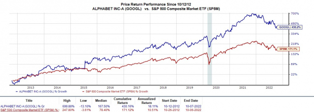 When considering GOOGL’s 10-year price performance the current stock price does appear to be a compelling opportunity. As shown in the nearby chart, GOOGL is up +430% over the last decade to crush the benchmarks +171%.