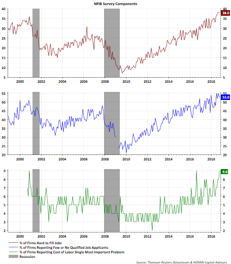 Areas around employment seem to be some of the most significant issues facing small businesses. Given the low unemployment rate, this is not much of a surprise. The below chart highlights three components of the survey surrounding some of the employment issues. The bottom panel in the chart (green line) shows one of the most important problems facing businesses is the cost of employment. Of the firms surveyed, 9% cited this as an issue, which ties the record high percentage set back in August 2016. Also at or near a record high is the percentage of firms stating it is hard to fill jobs as well as the difficulty in finding qualified applicants.