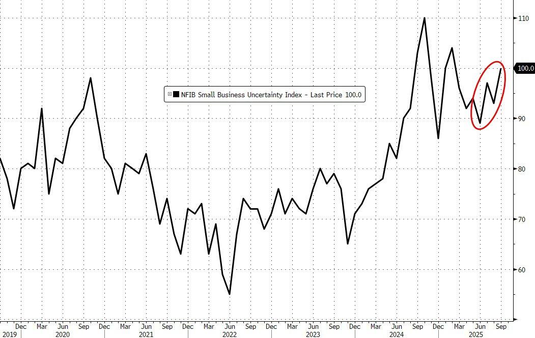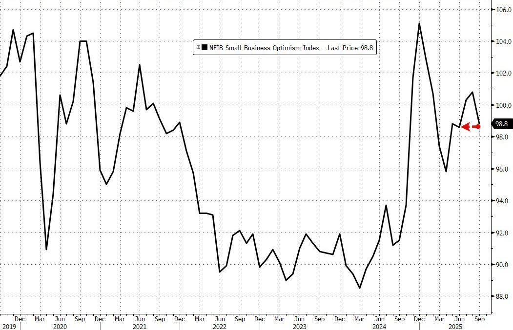 Amid a dearth of macro data due to the shutdowns, this month's Small Business Optimism survey suddenly becomes noteworthy with the headline sentiment index dipping in September to a three-month low (down 2 pts to 98.8) on less optimism about the economic outlook and greater concern about excess inventory.