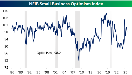 This morning's only economic report was the NFIB's Small Business Optimism Index. It came in weaker than expected, falling to 98.2 versus forecasts of 98.3. The index has now fallen in back-to-back months as it hovers in the 40th percentile of its historical range..