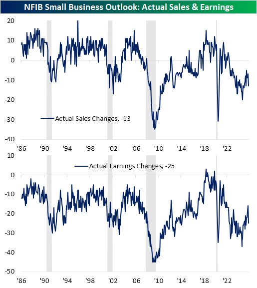 Of the inputs to the headline number, the most concerning decline was in actual earnings changes. That index fell 9 points MoM, which ranks as the sixth largest monthly decline in the index's history (data going back to 1986). Given that those are bottom-line changes, the cause for weaker earnings could be weaker revenues, higher costs, or a mix of both. However, weaker revenues appear to be the culprit.