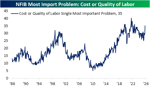 As noted earlier, for the topics labeled as small businesses' biggest problems, poor sales didn't move in October, and at 10% it ranks as the fourth-biggest issue of the 10 listed. Ahead of poor sales, inflation took a step back, falling 2 percentage points to 12% of responses, and taxes fell an identical amount to 16% of responses.The single most commonly reported problem in October was quality of labor. Of responding firms, 27% reported this as the biggest issue. In spite of other weak indicators concerning labor markets, that was the strongest reading since November 2021 and was up significantly from September. In fact, the 9 percentage point jump marked a record monthly gain.What's more, the share reporting cost of labor as the biggest issue actually fell 3 percentage points to 8%.