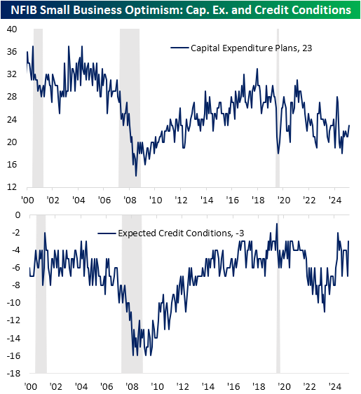 One bright spot of the October report concerned financing.As rates have continued to fall, there has been an uptick in capex plans and expected credit conditions. For the latter, the 4-point jump month-over-month was one of the largest one-month increases on record, and current levels are also at the high end of the past few decades' range.
