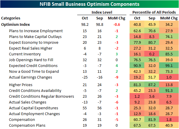 For starters, the index for higher prices remains in the top quintile of readings throughout the survey's history, but there was a 3-point decline in October. Meanwhile, the index for actual sales changes (not an input into the overall optimism index) fell by a more significant 6 points in October to the lowest level since May.That six-point decline ranks in the 6th percentile of monthly moves, and the current level of the index is now in the bottom decile of historical readings. Interestingly, despite the moves in those indices, the share of respondents who reported poor sales as their biggest problem was unchanged at 10%.