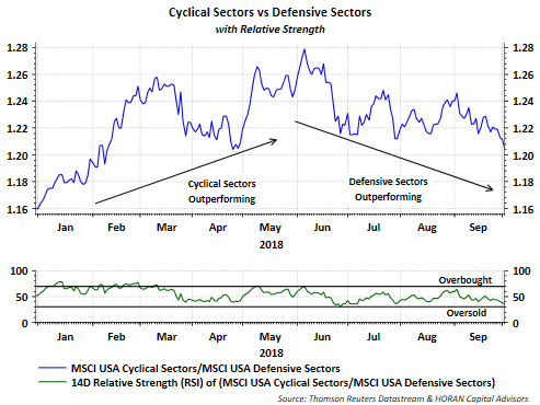 The underperformance of small-cap stocks now and beginning to see the outperformance of the defensive sector index one might ask whether investors are becoming too cautious or not. Economic and company fundamentals continue to be positive and should be supportive of a favorable economic and market environment.