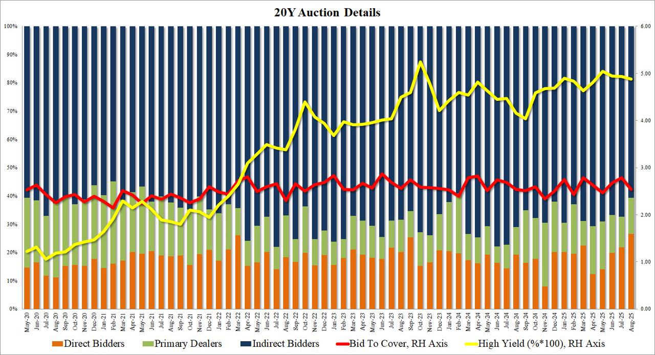 The auction prices at a high yield of 4.876%, down from 4.935% in July and stopped through the When Issued 4.877% by 0.1bps, the second consecutive stop through after 2 tails.