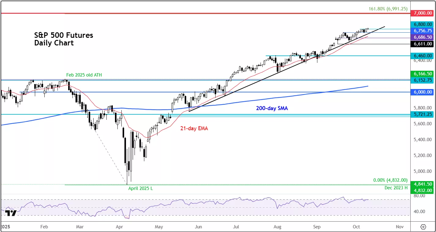 With no major economic news on the horizon due to the government shutdown and bearish catalysts minimal, markets continue to grind higher. The S&P 500 futures hit new highs overnight before easing slightly. Can we see the rally extend further head of the earnings season? Until now, investors have largely ignored worries of a potential bubble in tech names, hoping that the companies will be able to meet or exceed high expectations. There’s also been some focus on the restart of the Fed’s interest-rate cuts, with hopes of two more cuts in 2025 helping to offset worries about the labour market cooling.