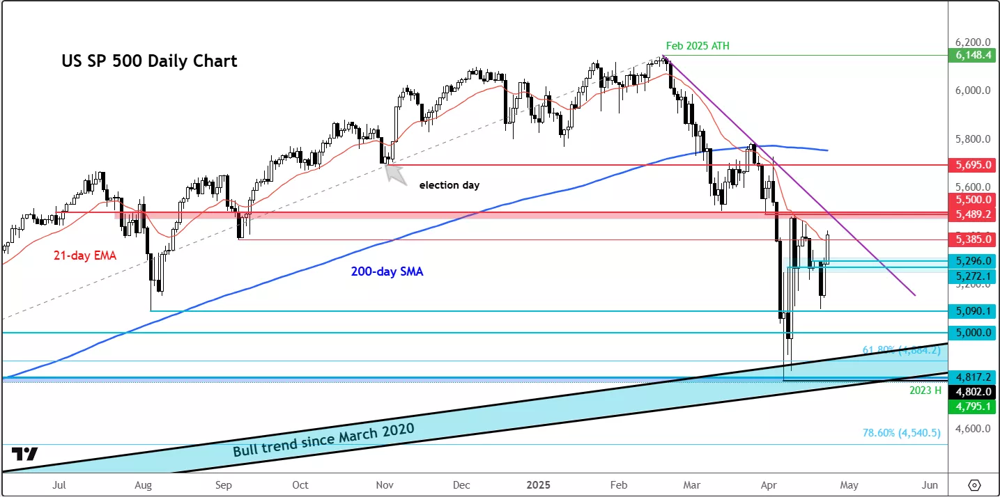 The unwinding of “sell America” trade continued in the first half of Wednesday’s session. S&P 500 futures jumped 2%, adding to yesterday’s similar gains. All sorts of risk assets rallied, from global indices to Bitcoin, while safe haven gold slumped, at its lowest point, by a huge $200 from its record high of $3500 hit in the previous session. The US dollar also initially rallied, before easing back down. The greenback’s more muted reaction suggests economic concerns linger. The risk rally all started on hopes that the US is getting closer to making trade deals with some of its trading partners like India and Japan. Then Trump turbo-charged the rally as he tried to defuse the tensions, by suggesting he isn’t planning to fire Fed Chair Jerome Powell and floated the possibility of cutting tariffs on China. Trump can certainly talk the talk, but can he also walk the walk? Until he does that, we will remain cautious on our S&P 500 forecast.