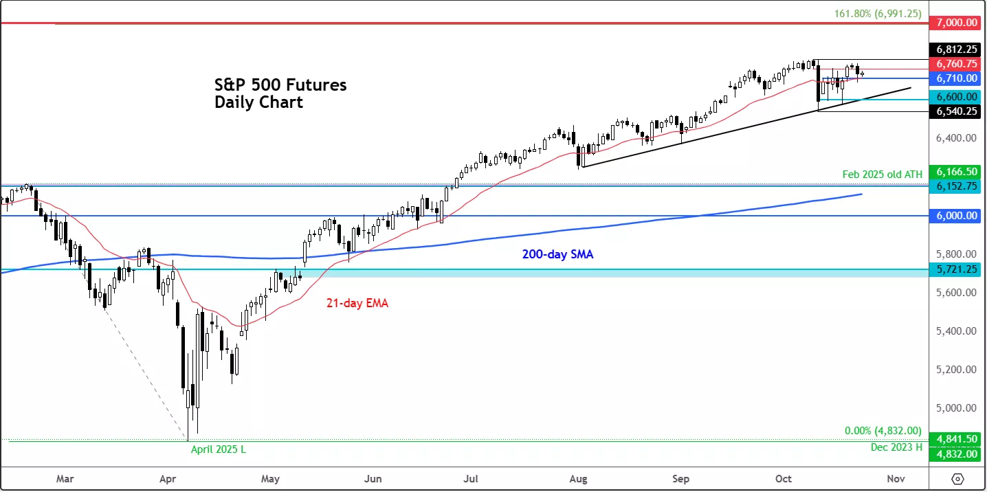 For now, immediate support sits around 6,700–6,710 on the S&P 500 futures chart — roughly in line with a couple of daily highs and closes from the previous week, and the 21-day exponential moving average. Below these levels, you have a short-term trend line coming in around 6,600-6,610 area. Finally, this month’s low comes in at 6540, where many stop orders are likely parked.