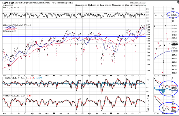 There are, potentially, bullish signals forming on the SPX:VIX Ratio, as well, with price attempting to remain above 200, the formation of a new bullish crossover on MACD, and an imminent formation of a bullish crossover on PMO, as shown on the following Daily ratio chart. However, the RSI indicator remains muted, but remains above the 50 level...still a positive sign for equity bulls.