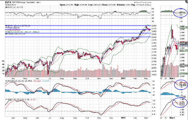 The SPX was, at the time of the above-referenced post, languishing just below 2300. It closed out this week at 2372.60, after my projected December 2017 target of 2400 was hit, 10 months early, on March 1st (see my same-day post here), as shown on the Daily chart below.