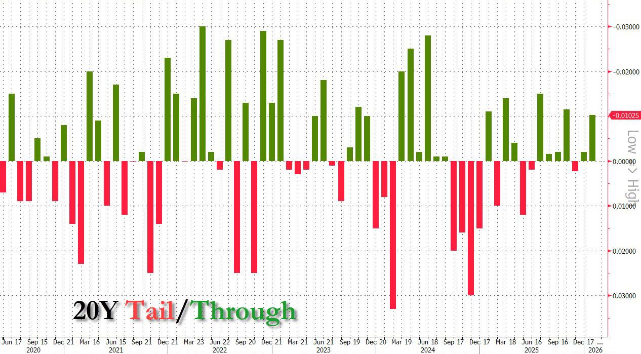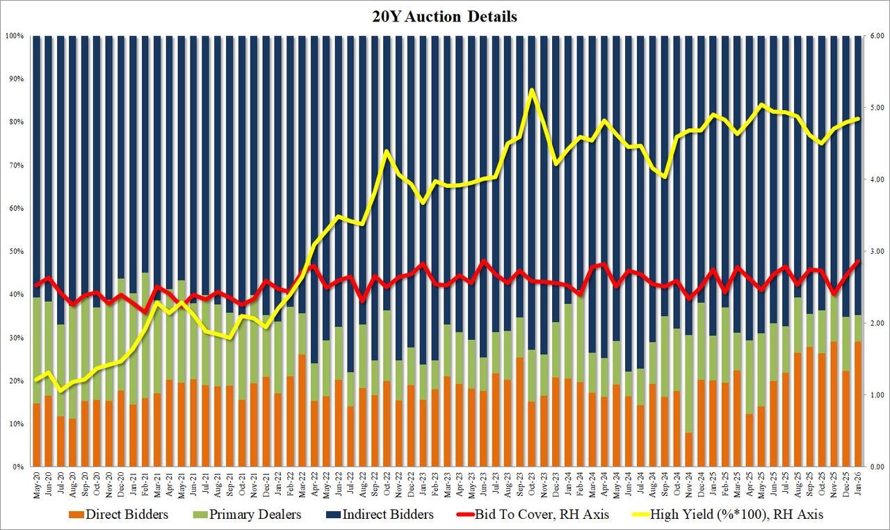 Overall, this was a stellar 20Y auction, and one which pushed yields in the secondary market slightly lower after news of the break, although with many other factors determining yields (Japan, Greenland, earnings), don't expect the auction's impact on the broader market to last.