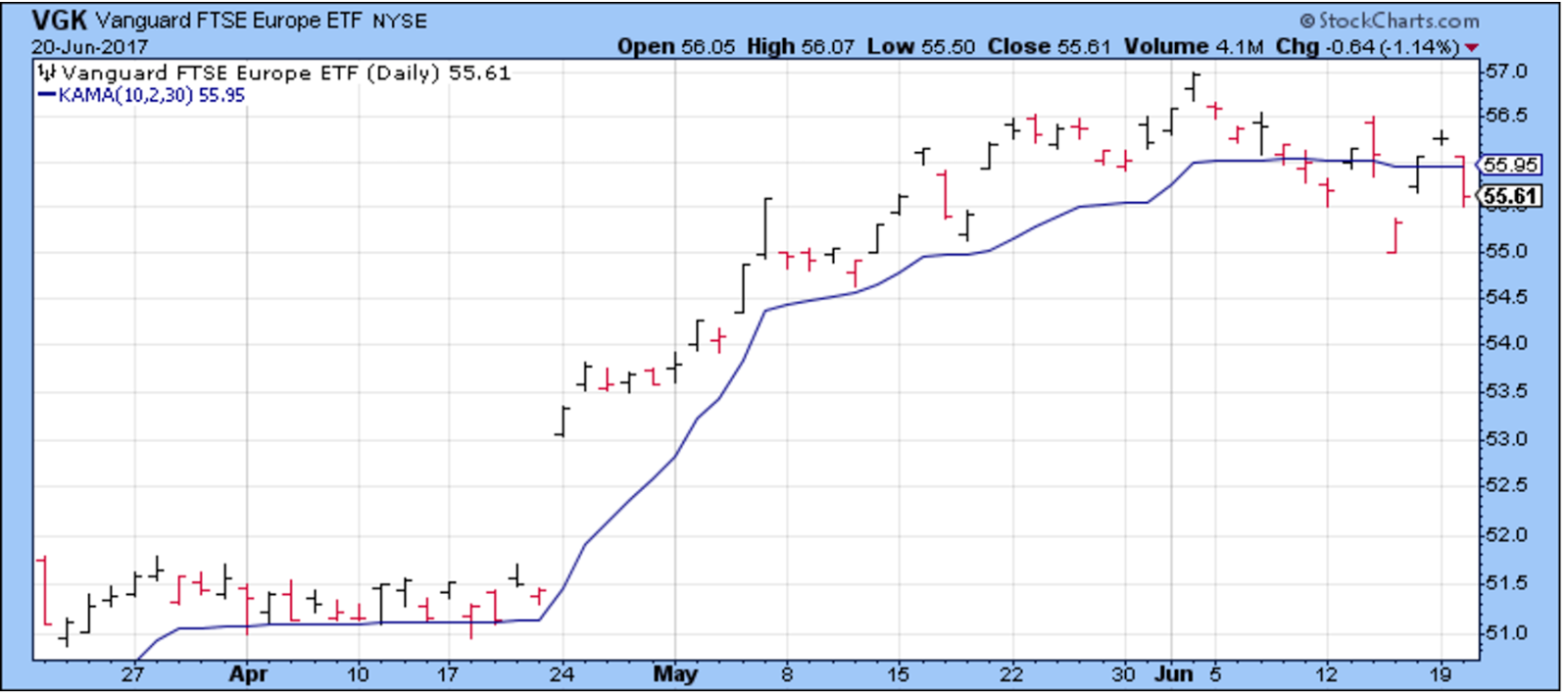 European stocks denominated in US Dollars in this ETF are showing weakness after a strong run.