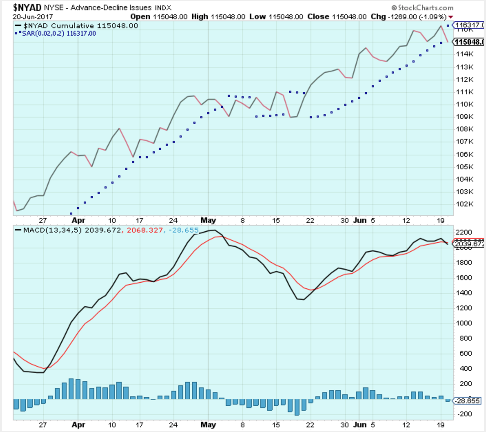 Stocks seem ready to pullback. The NYSE AD line has been a good indicator to follow this year to get a feel for market direction, and at the moment it is showing a bit of weakness.