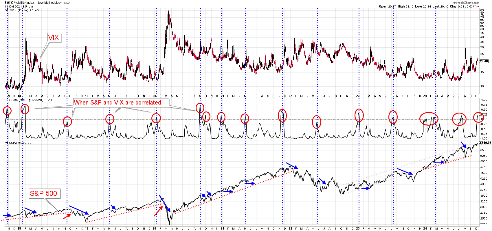 The S&P 500 is on a tear, and surprisingly seems to be defying all odds. Things just keep humming along, so we will continue to ride this trend as long as the wave continues. The chart below indicates that we may be poised for a small pull back in the not too distant future however - not sure exactly when or to what degree. Therefore, we do not plan to try and get ahead of it, but it is a data point certainly worth noting. When the VIX (fear index) and the S&P 500 are positively correlated (red circles below), it typically leads to either a consolidation of gains or a pull back in the market. Essentially this means that fear is rising and so is the market - which is contrary to logic. We obviously won't know until it happens, and again, it's not necessarily actionable at the time, but definitely worth keeping our eye on, and hopefully this relationship won't lead to a big surprise. We're watching!