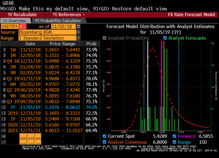The Great Graphic above contains a great deal of information. On the led hand side, you can see the one-year-time frame is highlighted. What it says is that based on current volatility the dollar will likely (74%) trade between TRY5.1080 and TRY8.063.