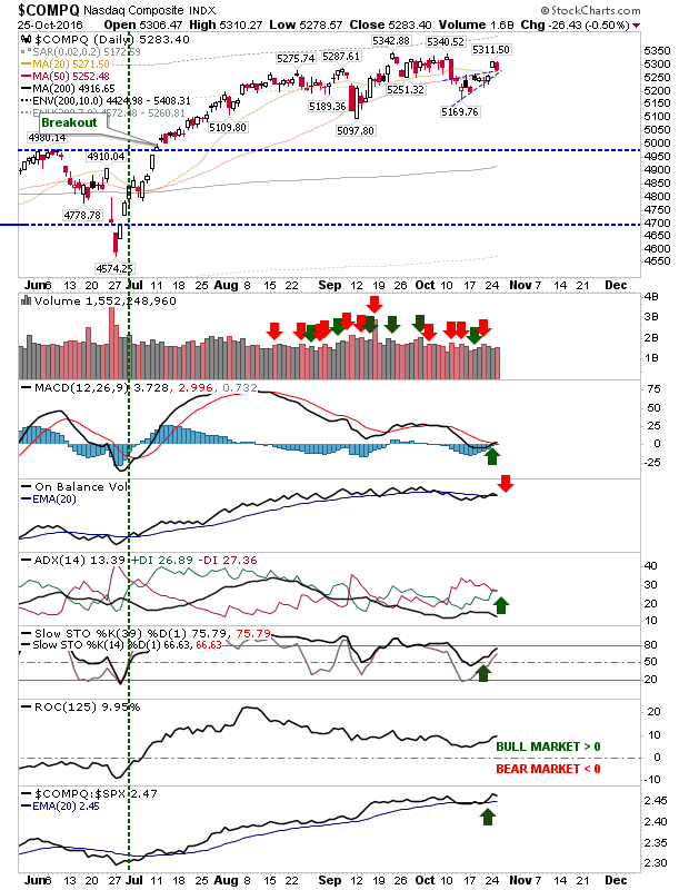Meanwhile, the Nasdaq cleared wedge resistance yesterday, and was able to hang on to the breakout despite today's loss. It too enjoyed a MACD trigger 'buy', but had an On-Balance-Volume 'sell' to contend with too.
