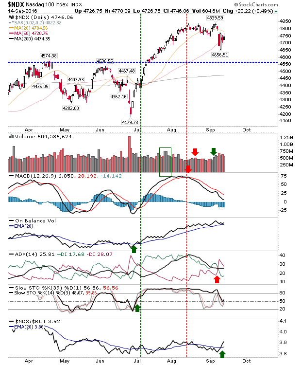 The day started with bulls enjoying a positive start, but much of these gains were clawed back by the close. The Nasdaq had the best of the action, doing enough to finish above yesterday's close - but not enough to finish at the day's highs. Instead, Tech averages left an 'inverse hammer' in what is looking like committed bearish action.