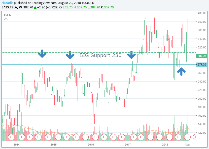 We told subscribers before Friday's open on Tesla "the stock can drift below $300 to $280". There is major support at $280 as you can see in the chart to the left.