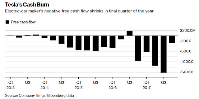 Tesla just released its fourth-quarter earnings last Wed posting its biggest quarterly loss ever in the fourth quarter -- negative free cash flow of $(276.8) million and an adjusted EPS of negative $3.04 for the quarter. For the whole 2017, Tesla’s free cash flow (FCF) was negative $3.48 billion.