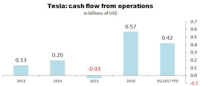 Note that this year up to date the company has generated lower cash flow than in 2016. Of course, the fourth quarter may be totally different but during first three quarters of 2016 Tesla delivered cash flow of $471.6M, which was a slightly higher figure than that reported this year ($420M). So there is some regress anyway.