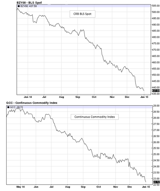 In fact the whole commodity complex took another led gown, as aluminum and copper came under pressure. Here are a couple of broad commodity indices worth following: the CRB BLS Spot Index and the Continuous Commodity Index - both at multi-year lows.