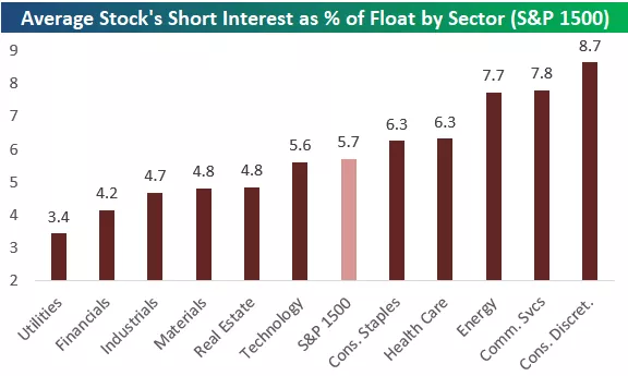 As shown below, Consumer Discretionary stocks are the most heavily shorted at 8.7%, followed by Communication Services and then Energy.