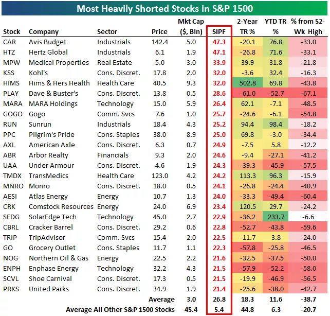 Notably, two rental car companies -- Avis (CAR) and Hertz (HTZ) -- are the most heavily shorted with nearly half of their floats sold short.