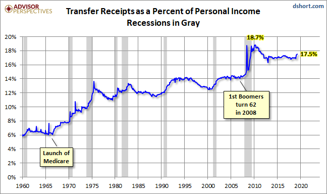 A Note on the Excluded Transfer Receipts: These are benefits received for no direct services performed. They include Social Security, Medicare & Medicaid, Unemployment Assistance, and a wide range other benefits, mostly from government, but a few from businesses. Here is an illustration of Transfer Receipts as a percent of Personal Income.