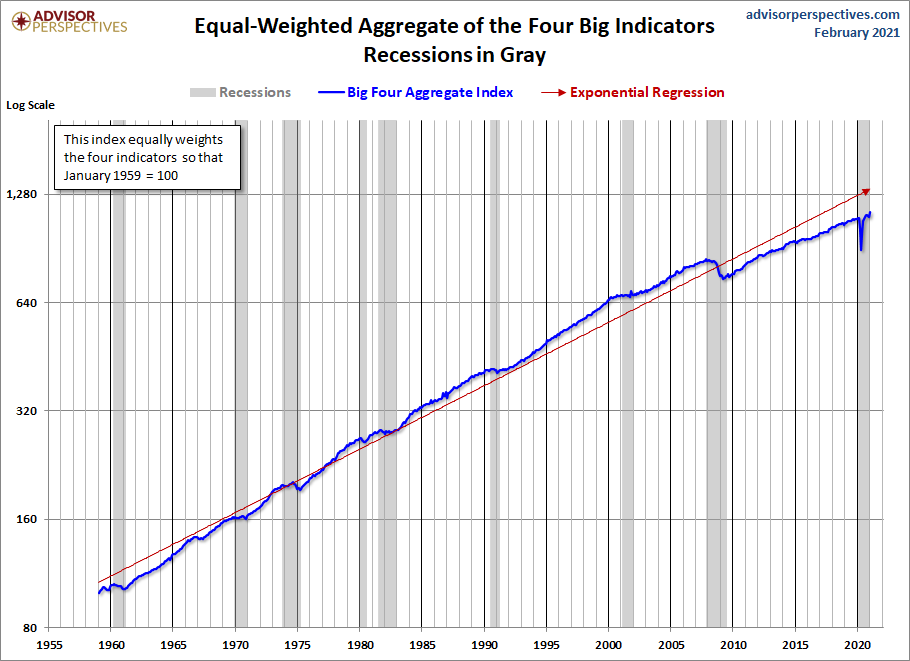 The charts above focus on the Big Four individually, either separately or overlaid. Now let's take a quick look at an aggregate of the four. The next chart is an index created by equally weighting the four and indexing them to 100 for the January 1959 start date. We've used a log scale to give an accurate indication of growth and also added an exponential regression to assist us in seeing the secular patterns of faster and slower growth. As we can readily see, growth of this aggregate indicator has slowed dramatically since the end of the last recession.