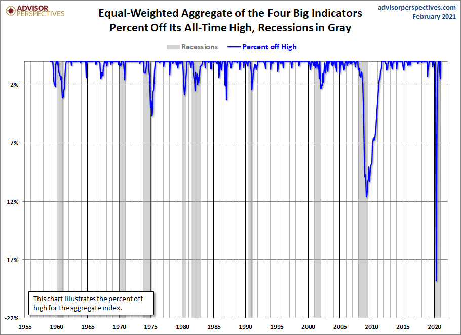 Now let's plot the percent off high for this aggregate index. As we immediately recognize, it is completely worthless as a leading indicator of recessions. The aggregate index set a new high the month before the recession began for five of the eight recessions since the early 1960s.