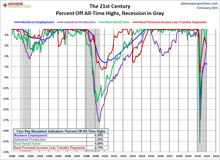 The charts above don't show us the individual behavior of the Big Four leading up to the 2007 recession. To achieve that goal, we've plotted the same data using a "percent off high" technique. In other words, we show successive new highs as zero and the cumulative percent declines of months that aren't new highs. The advantage of this approach is that it helps us visualize declines more clearly and to compare the depth of declines for each indicator and across time (e.g., the short 2001 recession versus the Great Recession). Here is our four-pack showing the indicators with this technique.