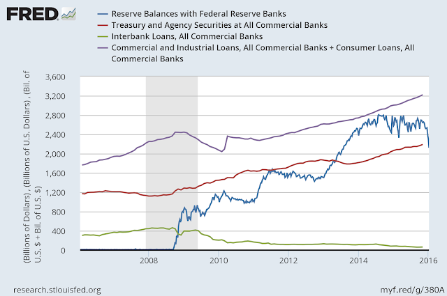 And the interbank market is all but dead. There is little doubt that this is due to the fact that QE gave bank far more reserves than they actually need to settle deposit withdrawals. If banks don't need to borrow reserves, they can't lend them either: thus, when banks are awash with reserves, the natural level for the Fed Funds Rate is zero, regardless of the state of the economy. The December rise in the Fed Funds Rate was important for what it signalled, not for its economic effects. The principal instrument of monetary policy is now the interest-on-excess-reserves (IOER) rate (or deposit facility rate, if you are an ECB-watcher), which the Fed backs up with ONRRP operations. This will remain the case as long as there are excess reserves in the banking system - which may be for a very long time. Welcome to the new normal.