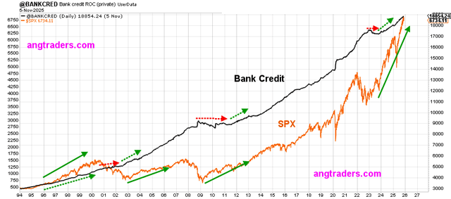 So far, bank credit is rising rapidly and contributing to the money-creation the economy and stock market require (chart below).