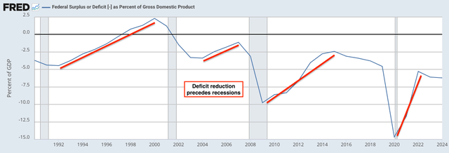 Every recession is preceded by reduced government deficits (red-highlights below), and every recovery is engineered by increasing government deficits (negative-sloping line below).