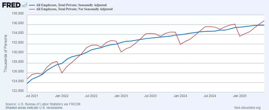 The good news is that, on a non-seasonally adjusted basis, 2.3 million jobs were added in the 2nd quarter of this year, the same number as was the case in for the NSA private monthly payrolls number. After seasonal adjustment, that translated into just under 200,000 jobs net for the three months, as per the below graph of SA and NSA private nonfarm payrolls over the past four years through June:
