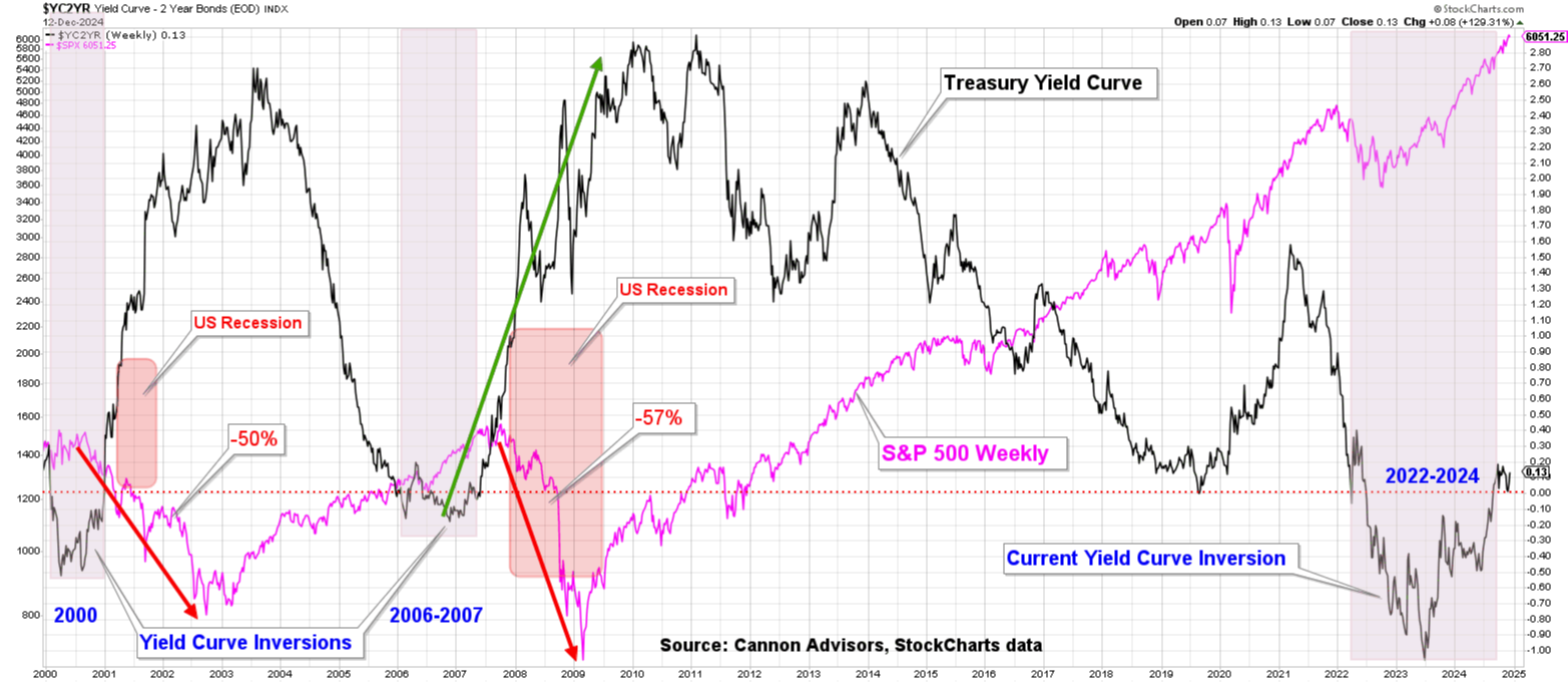 As you can see, the levels of Money Market investments rise prior to a recession. Keep in mind though that historically we generally experience a Yield Curve Inversion prior to a recession - meaning rates rise to fight inflation or a run-away market and folks make good returns on their cash. So maybe it's just a function of getting good returns with far less volatility, or maybe it's a sign of difficult times ahead - time will tell. Below is a chart illustrating the Yield Curve relative to both recessions as well as the S&P 500. Recently the Yield Curve just "normalized" or turned positive. I'm not calling for a stock market correction by any means (yet anyway), but it's important to take note of more than just the stock market levels, one of which is the great cash hoard.
