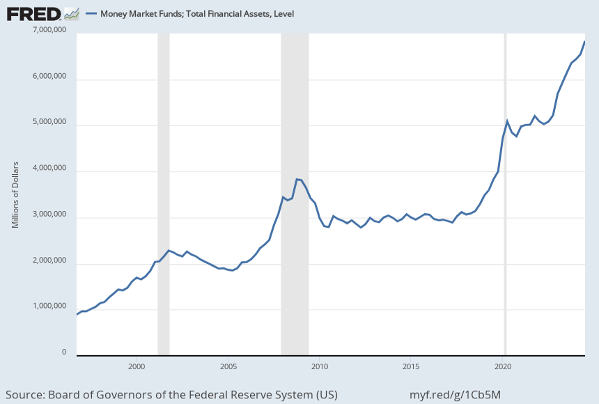 As of now, there are not too many reasons as to why you should not to be invested in the US Equity Markets; however, when things are going so smoothly, it may be time to begin looking for opposing underlying currents. One which we've identified is the money flow levels into Money Market funds. Certainly it could be simply a function of acceptable levels of "risk-free" returns, or is it a prelude to something bigger?? In the chart below, you'll see historical levels of money market funds relative to US Recessions (grey bars).